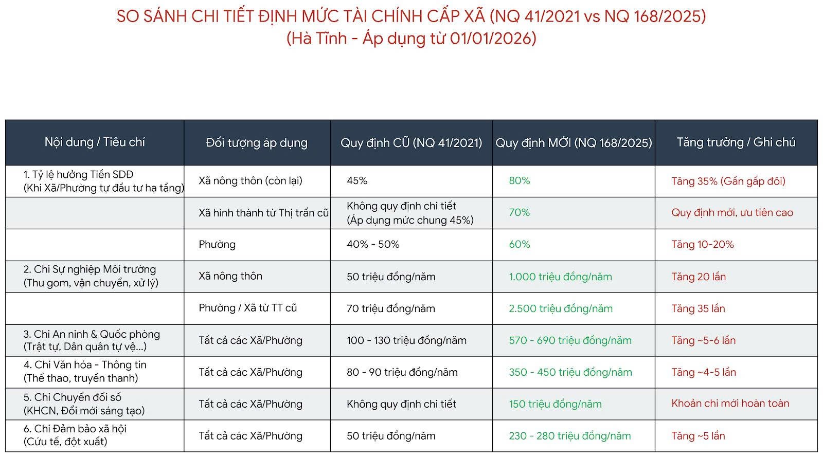 Nghị quyết 168/2025/NQ-HĐND là một bước tiến lớn trong phân cấp tài chính. Bằng việc kết hợp giữa cơ chế "thưởng" nguồn thu đất đai (Điều 7), tăng mạnh chi phí môi trường (Điều 35) và bổ sung nguồn lực chuyển đổi số (Điều 33c). Hà Tĩnh đang hướng tới một năm ngân sách 2026 chủ động, hiệu quả và bền vững hơn cho chính quyền cơ sở.