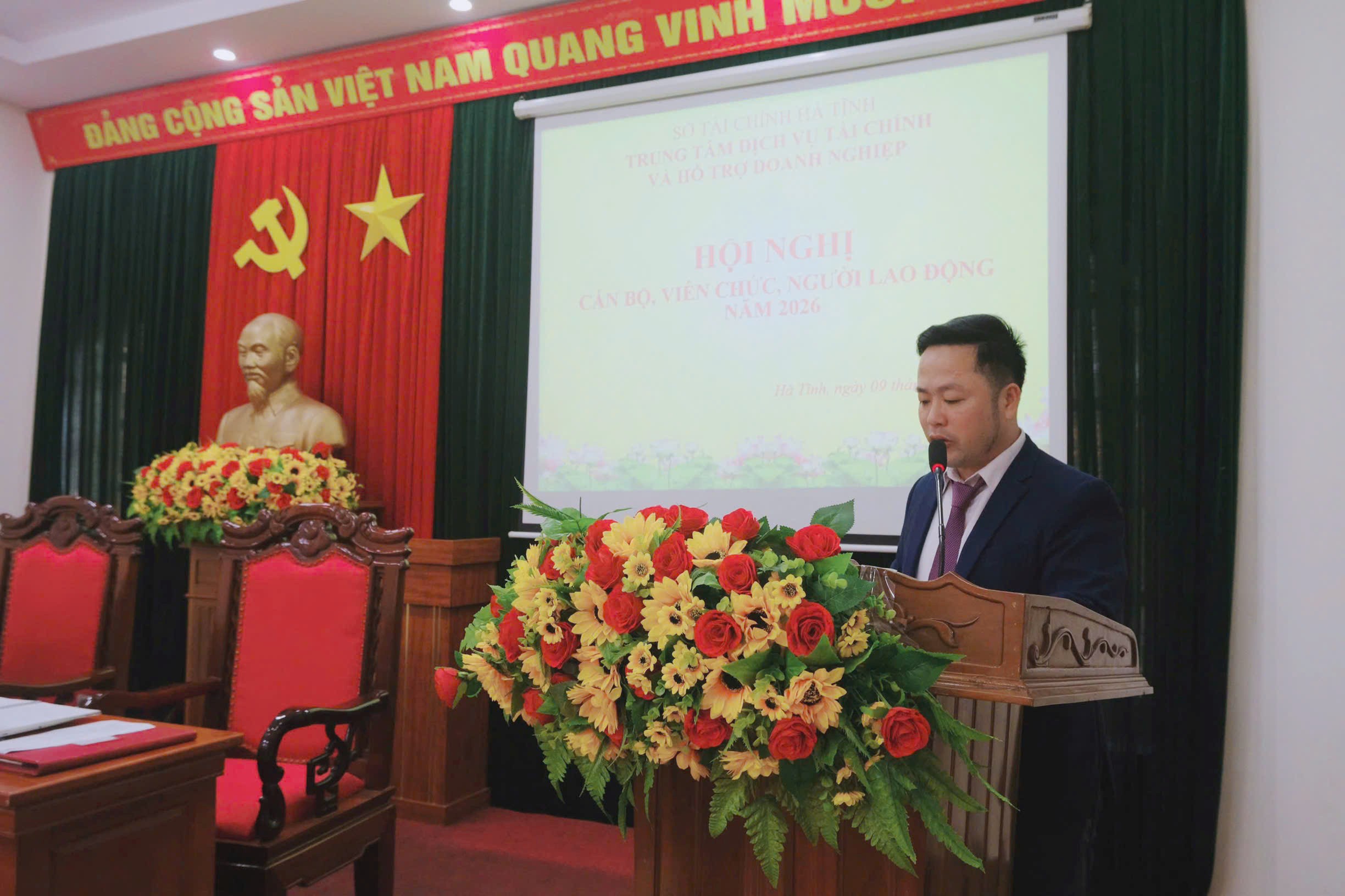Phát biểu bế mạc Hội nghị, đồng chí Phó Giám đốc phụ trách Trung tâm kêu gọi toàn thể cán bộ, viên chức, người lao động tiếp tục phát huy tinh thần đoàn kết, trách nhiệm, chủ động, sáng tạo trong công việc; chấp hành nghiêm kỷ luật, kỷ cương hành chính; phấn đấu hoàn thành tốt các nhiệm vụ được giao trong năm 2026, góp phần xây dựng Trung tâm Dịch vụ Tài chính và Hỗ trợ Doanh nghiệp ngày càng ổn định, phát triển và vững mạnh.