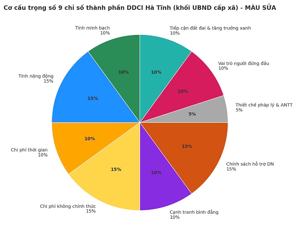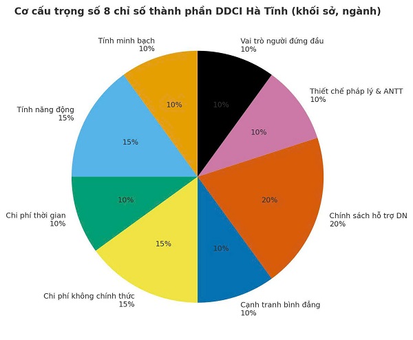 Bộ chỉ số DDCI Hà Tĩnh gồm 8 chỉ số thành phần đối với khối sở, ngành và 9 chỉ số đối với UBND cấp xã. Mỗi chỉ số thành phần vừa là tiêu chí đánh giá, vừa là “nhiệm vụ hành động” của từng đơn vị đối với cộng đồng doanh nghiệp nói riêng và công cuộc cải thiện môi trường kinh doanh của tỉnh nói chung.